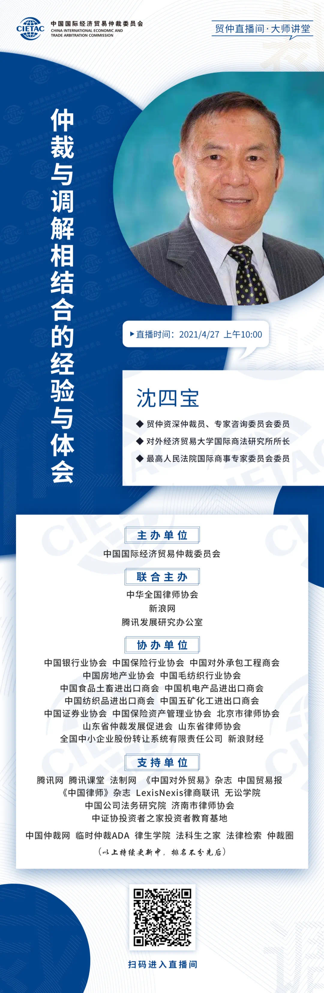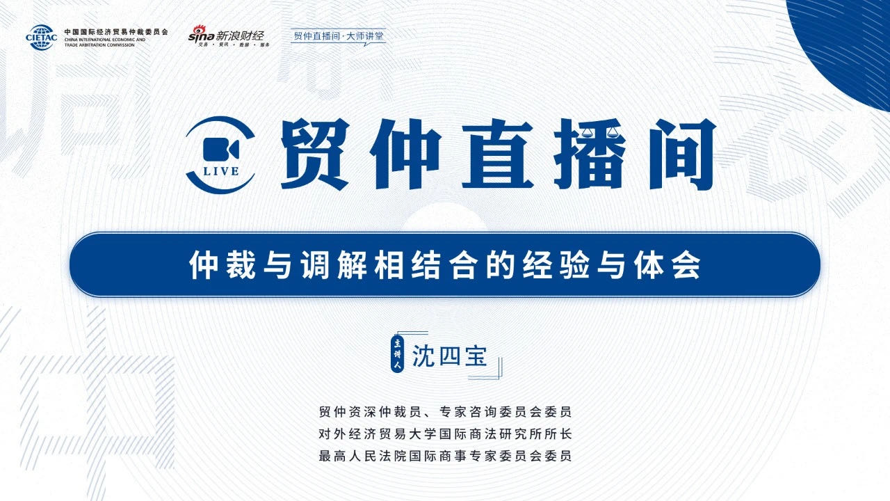 貿(mào)仲直播間-大師講堂系列課程第三講將于2021年4月27日(星期二)上午10時(shí)邀請(qǐng)貿(mào)仲資深仲裁員、專家咨詢委員會(huì)委員,對(duì)外經(jīng)濟(jì)貿(mào)易大學(xué)國(guó)際商法研究所所長(zhǎng),最高人民法院國(guó)際商事專家委員會(huì)委員沈四寶教授,講解“仲裁與調(diào)解相結(jié)合的經(jīng)驗(yàn)與體會(huì)”。
