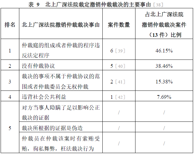 2020年全國(guó)法院、北上廣深法院撤銷(xiāo)仲裁裁決的事由分別如表8、表9所示。