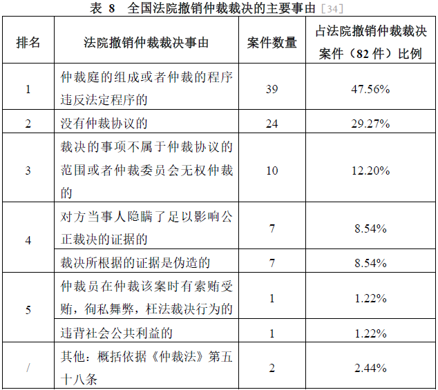 總體來(lái)看,與2019年情況相似,法院多以違反法定程序、沒(méi)有仲裁協(xié)議、超裁為由撤銷(xiāo)仲裁裁決。相較而言,隱瞞證據(jù)、偽造證據(jù)、枉法裁決、違反社會(huì)公共利益這4項(xiàng)事由適用較少,尤其是以枉法裁決、違背社會(huì)公共利益為由裁定撤銷(xiāo)裁決的案件,均分別只有1件。[35]