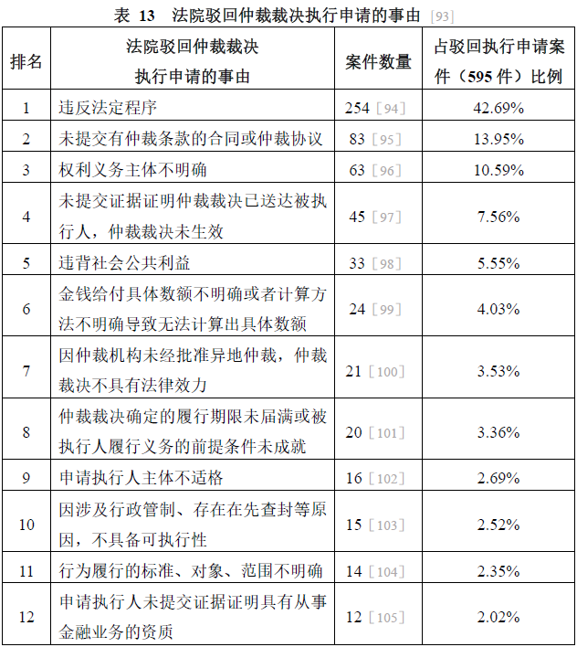 司法實(shí)踐中,法院在駁回仲裁裁決執(zhí)行申請(qǐng)時(shí),通常援引的法律依據(jù)有兩類(lèi):一是《仲裁裁決執(zhí)行規(guī)定》第三條、第四條,二是《最高人民法院關(guān)于人民法院執(zhí)行工作若干問(wèn)題的規(guī)定(試行)》第十八條(2020年修正后為第十六條)。2020年595件被裁定駁回執(zhí)行申請(qǐng)的案件所涉事由如表13所示。