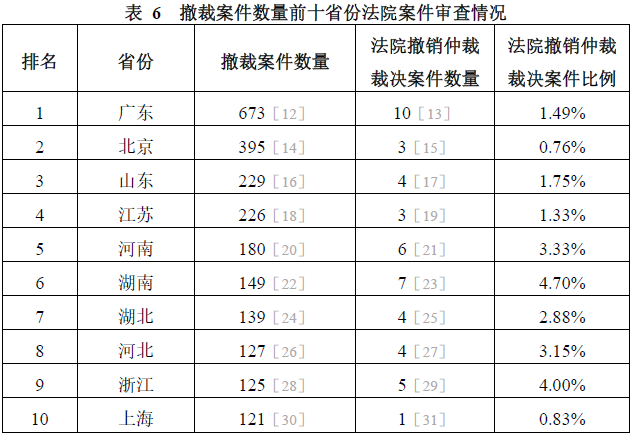 除去申請(qǐng)人撤回申請(qǐng)、法院按申請(qǐng)人撤回申請(qǐng)?zhí)幚砑安门形臅?shū)未公開(kāi)的案件外,我們對(duì)有效樣本案件進(jìn)行統(tǒng)計(jì),梳理了撤裁案件數(shù)量排名前十省份的案件審查情況。其中5個(gè)省份裁定撤銷(xiāo)裁決的案件比例高于全國(guó)水平(2.25%),分別為湖南(4.70%)、浙江(4%)、河南(3.33%)、河北(3.15%)、湖北(2.88%);其余5個(gè)省份裁定撤銷(xiāo)裁決的案件比例較低,分別為山東(1.75%)、廣東(1.49%)、江蘇(1.33%)、上海(0.83%)、北京(0.76%)。具體情況如表6所示。