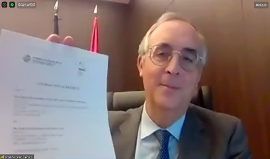 2021年7月8日,中國(guó)國(guó)際經(jīng)濟(jì)貿(mào)易仲裁委員會(huì)(CIETAC)與西班牙馬德里國(guó)際仲裁中心(MIAC)通過(guò)線上方式舉行了《合作協(xié)議》簽署儀式。貿(mào)仲副主任兼秘書長(zhǎng)王承杰先生與馬德里國(guó)際仲裁中心主席José Antonio Caínzos先生分別代表雙方在《合作協(xié)議》上簽字。馬德里國(guó)際仲裁中心秘書長(zhǎng)及馬德里律師協(xié)會(huì)國(guó)際關(guān)系負(fù)責(zé)人一同出席了本次儀式。