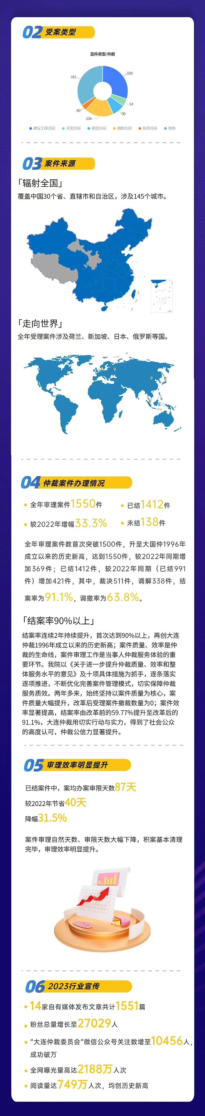 2023年,是大連國(guó)際仲裁院(大連仲裁委員會(huì))順利完成體制機(jī)制改革的第三個(gè)年頭。大連國(guó)際仲裁院堅(jiān)定不移在法治軌道上推進(jìn)大連仲裁發(fā)展體系和能力現(xiàn)代化。全年仲裁業(yè)務(wù)實(shí)現(xiàn)跨越式發(fā)展,辦案質(zhì)效全面提升,公共法律服務(wù)平臺(tái)的輻射面持續(xù)擴(kuò)大,機(jī)構(gòu)品牌的影響力和公信力不斷增強(qiáng)。在推進(jìn)東北亞國(guó)際仲裁中心建設(shè),營(yíng)造優(yōu)質(zhì)的法治化營(yíng)商環(huán)境,擦亮“大連仲裁”的金字招牌上邁出堅(jiān)實(shí)步伐。