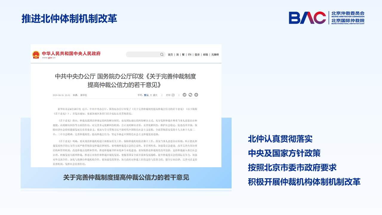 北仲認(rèn)真貫徹落實中央及國家方針政策,按照北京市委市政府要求積極開展了仲裁機構(gòu)體制機制改革。