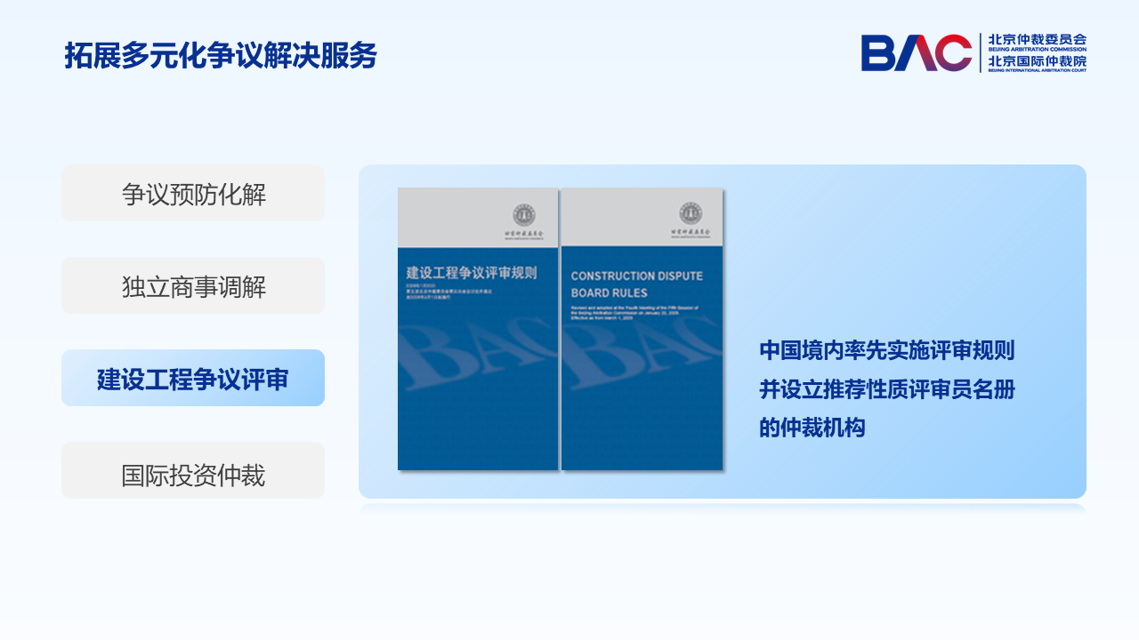 北仲在2009年即頒布了《建設(shè)工程爭議評審規(guī)則》,是中國境內(nèi)率先實施評審規(guī)則并設(shè)立推薦性質(zhì)評審員名冊的仲裁機構(gòu)。這一規(guī)則在實踐中多次被當(dāng)事人選擇適用,并成功助力當(dāng)事人快速解紛。同時,這一規(guī)則也為聯(lián)合國貿(mào)法會第二工作組于2022年啟動的審裁規(guī)則的制定提供了中國經(jīng)驗。