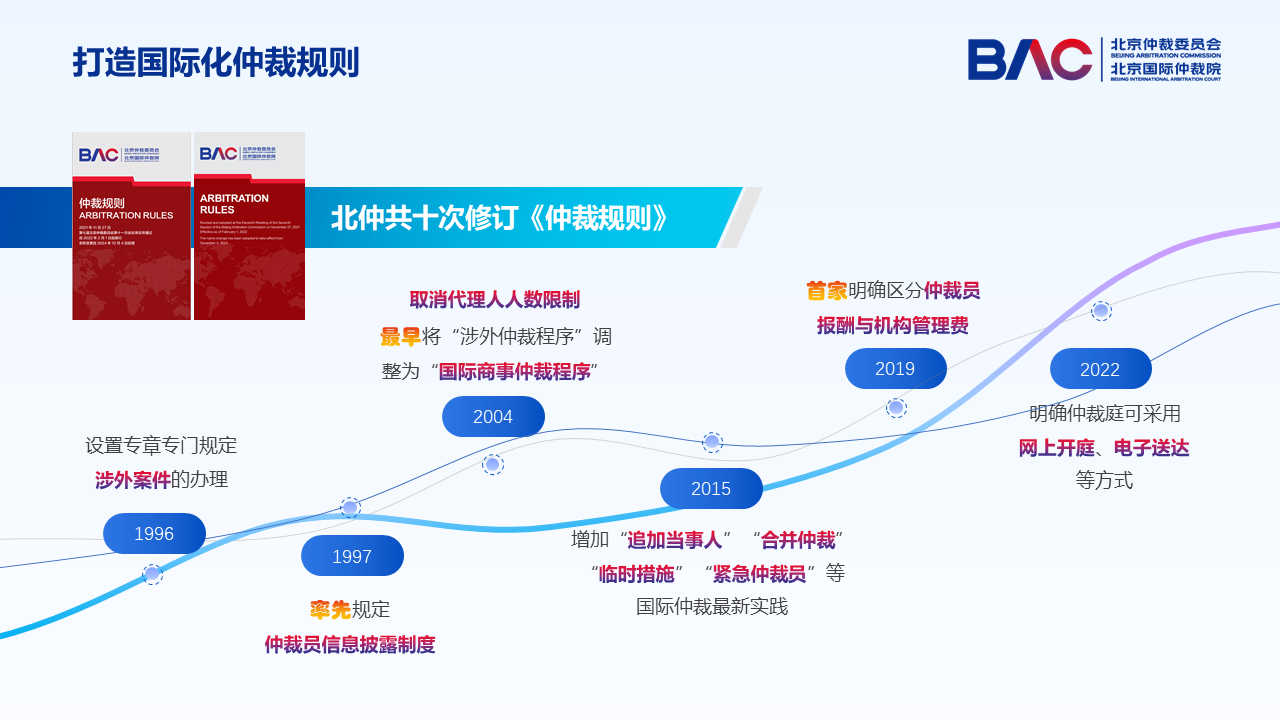 成立至今,北仲共計十次修訂《仲裁規(guī)則》。歷次修訂均緊跟國際仲裁先進(jìn)實踐,廣受國內(nèi)外關(guān)注,已成為仲裁規(guī)則修訂完善的行業(yè)引領(lǐng)者。