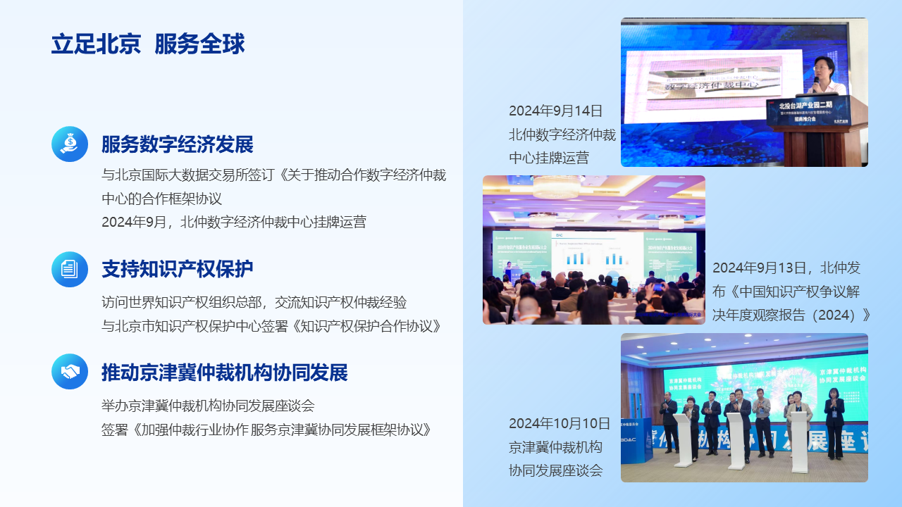 發(fā)揚仲裁靈活高效的特色,北仲與北京國際大數(shù)據(jù)交易所簽訂《關(guān)于推動合作數(shù)字經(jīng)濟(jì)仲裁中心的合作框架協(xié)議》,并在此協(xié)議基礎(chǔ)上共同建設(shè)北仲數(shù)字經(jīng)濟(jì)仲裁中心。保護(hù)科創(chuàng)成果,維護(hù)科創(chuàng)市場,北仲積極推動與有關(guān)單位在知識產(chǎn)權(quán)領(lǐng)域的交流合作。推動京津冀仲裁機構(gòu)協(xié)同發(fā)展,北仲同十三家京津冀地區(qū)仲裁機構(gòu)和河北省司法廳、河北省仲裁協(xié)會舉辦京津冀仲裁機構(gòu)協(xié)同發(fā)展座談會。