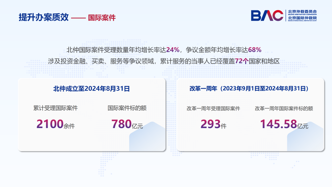 歷經(jīng)十年,北仲的國際化發(fā)展成績(jī)斐然。截至2024年8月31日,北仲累計(jì)受理國際案件2100余件,所涉標(biāo)的額達(dá)780億元,主要涉及投資金融、買賣、服務(wù)等爭(zhēng)議領(lǐng)域,累計(jì)服務(wù)的當(dāng)事人已經(jīng)覆蓋72個(gè)國家和地區(qū)。其中,改革換屆以來,自2023年9月1日至2024年8月31日,北仲受理國際案件293件,爭(zhēng)議金額達(dá)145.58億元,分別占北仲國際案件受理總量的13.95%和國際案件受理總金額的18.66%。