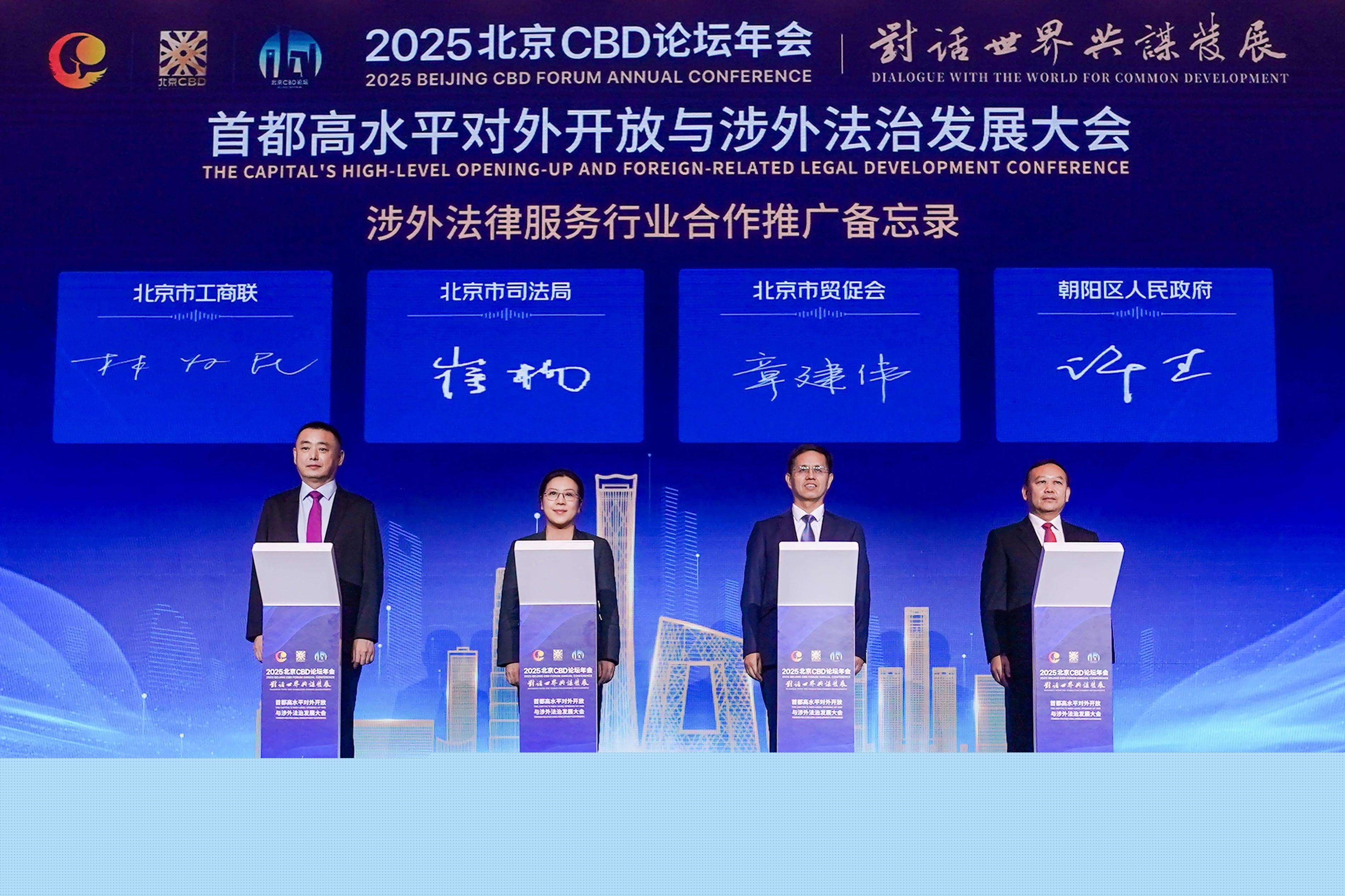 北京市司法局、朝陽(yáng)區(qū)人民政府、北京市貿(mào)促會(huì)、北京市工商聯(lián)圍繞涉外法律服務(wù)機(jī)構(gòu)推介和政策保障事項(xiàng)共同簽署《涉外法律服務(wù)行業(yè)合作推廣備忘錄》。