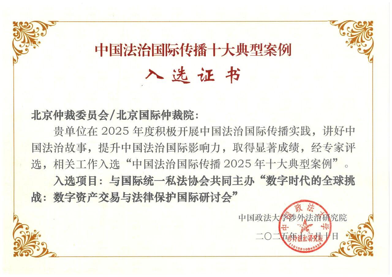 為加強(qiáng)中國(guó)法治的國(guó)際傳播,統(tǒng)籌推進(jìn)國(guó)內(nèi)法治與涉外法治,中國(guó)政法大學(xué)涉外法治研究院組織評(píng)選并發(fā)布了2025年“中國(guó)法治國(guó)際傳播十大典型案例”。北京仲裁委員會(huì)/北京國(guó)際仲裁院/中國(guó)(北京)證券期貨仲裁中心(以下稱“北仲”)與國(guó)際統(tǒng)一私法協(xié)會(huì)(UNIDROIT)、北京國(guó)際爭(zhēng)議解決發(fā)展中心共同主辦的“數(shù)字時(shí)代的全球挑戰(zhàn):數(shù)字資產(chǎn)交易與法律保護(hù)”國(guó)際研討會(huì)成功入選。這是繼2020年北仲舉辦的中國(guó)商事爭(zhēng)議解決年度觀察海外發(fā)布會(huì)入選2020“中國(guó)法治國(guó)際傳播十大典型案例”后,北仲實(shí)踐再次入選。
