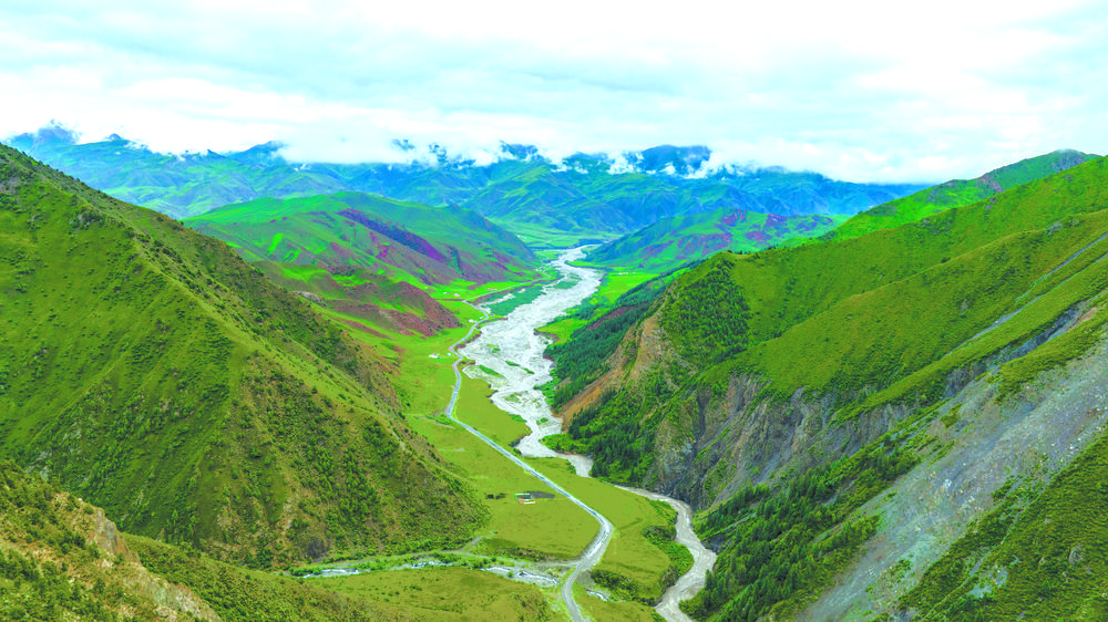 夏日的祁連山林木青翠,風(fēng)景如畫,高低延綿的山脈在陽光的照耀下交相輝映,近處的群山被此起彼伏的林海包圍,郁郁蔥蔥。