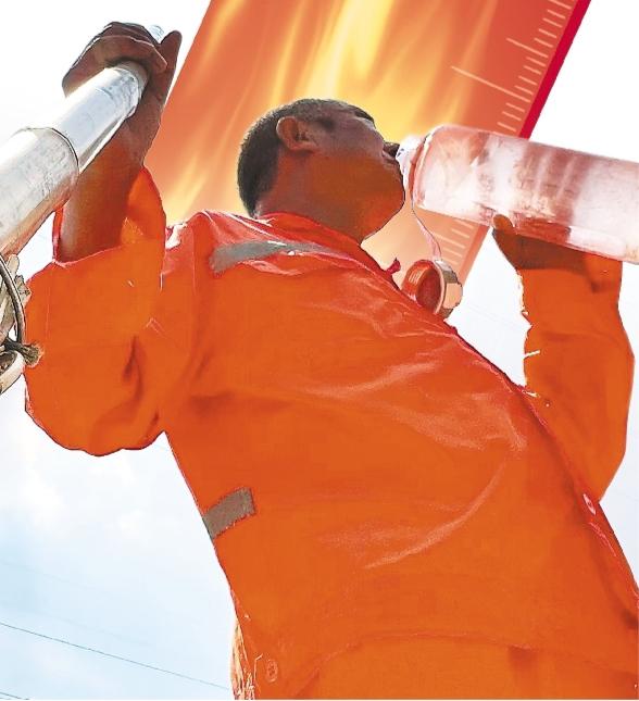 在合肥高新區(qū)天湖路與科學大道交口,環(huán)衛(wèi)工人在休息期間大口喝水。 記者 張正朋 攝