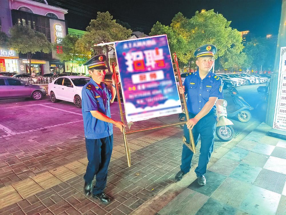 夏季是夜宵燒烤攤點(diǎn)店外經(jīng)營、流動(dòng)瓜果散販增多的高峰季節(jié),使得夜間城市管理難度加大?!袄习澹瑥V告牌不能占道擺放,我們幫您搬進(jìn)店內(nèi)!”8月25日晚8點(diǎn),夜幕來臨,在磨子山南路,路燈照亮了岳陽樓區(qū)城管委城管三大隊(duì)執(zhí)法隊(duì)員忙碌的身影,他們正在對(duì)夜間人流量較大、群眾反復(fù)投訴的重點(diǎn)難點(diǎn)路段和區(qū)域進(jìn)行巡查管控,嚴(yán)防夜市出店經(jīng)營、露天燒烤、油煙污染及夜間施工場(chǎng)地?fù)P塵污染、違規(guī)渣土車無證運(yùn)輸?shù)葐栴}發(fā)生。