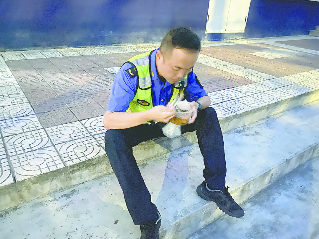 圖① 山陽區(qū)城管隊員王鵬坐在馬路臺階上就餐。