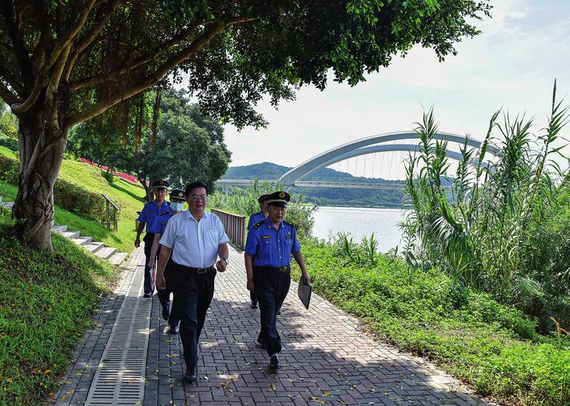南寧市城管綜合執(zhí)法局局長(zhǎng)梁勇(前左一)、南寧市城管支隊(duì)支隊(duì)長(zhǎng)牛繼成(前右一)帶隊(duì)巡查邕江沿岸公園(本版圖片均由南寧市城管支隊(duì)提供)