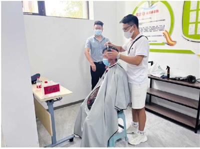 外賣小哥在清馨苑社區(qū)的新就業(yè)群體服務(wù)驛站免費理發(fā)