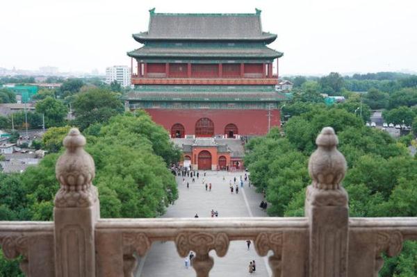 北京中軸線北端為北京鼓樓、鐘樓,南端為永定門,縱貫北京老城,全長(zhǎng)7.8公里,是由一系列古代皇家建筑、城市管理設(shè)施和居中歷史道路、現(xiàn)代公共建筑和公共空間共同構(gòu)成的城市歷史建筑群。