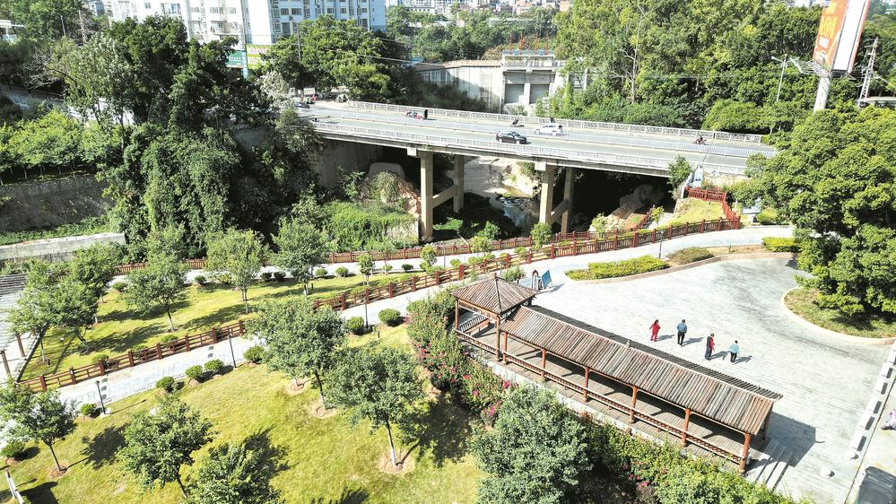 步道干凈整潔、河溝清水流淌、鳥(niǎo)鳴聲清脆悅耳……每天一大早,居住在城區(qū)維林市場(chǎng)的居民羅壽豐都會(huì)帶孫子到草鞋溝生態(tài)公園散步。這里樹(shù)木成蔭,綠草遍地,大小不一的鵝卵石錯(cuò)落鋪設(shè)在步道一側(cè),醒目的紅漆圍欄點(diǎn)綴著河溝兩岸的綠茵植被,一片秋意盎然。