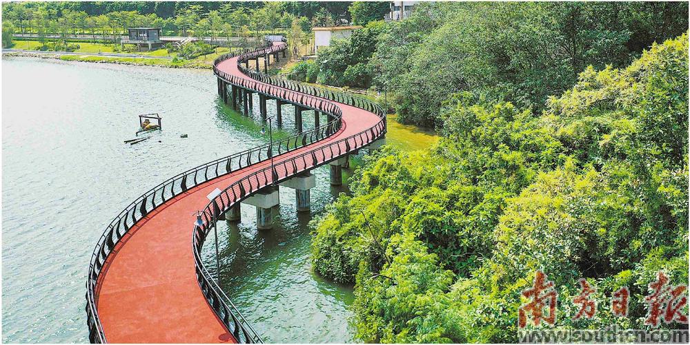 秋日的清遠萬里無云,市區(qū)鐵塔體育公園東邊一路之隔的大木洲公園綠意盎然,1000平方米花卉與400多株喬灌木錯落有致,停車位整齊劃一。公園良好的生態(tài)環(huán)境和濕地景觀沿著龍瀝大排坑大木洲段往東延伸,吸引了不少市民到此騎行休閑。