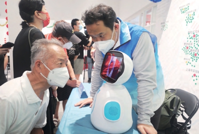 “醫(yī)加醫(yī)健康機器人”入駐普陀區(qū)部分居民區(qū),護衛(wèi)居民健康。該機器人”具有24小時在線診療、互聯(lián)網(wǎng)醫(yī)院門診預約、慢病配藥等為老服務(wù)功能。 攝影/張龍
