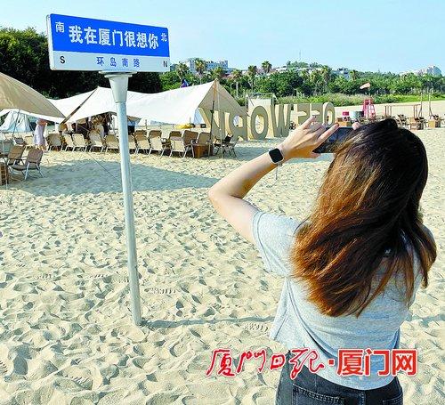 近日,記者來到寶龍一城,在外圍一家奶茶店附近,一個藍白相間的路牌被放置在路中間,牌上寫著“我在廈門很想你”,上面標注著“南、北”方向,為了確認路牌上標注的準確性,記者打開手機的“指南針”App對照,發(fā)現(xiàn)路牌所標注的地理位置并不準確。在環(huán)島南路的椰風寨附近一個戶外露營地,沙灘上醒目的位置也立著一塊路牌,上面的標識與寶龍一城的基本一致,不少游客在此打卡拍照。