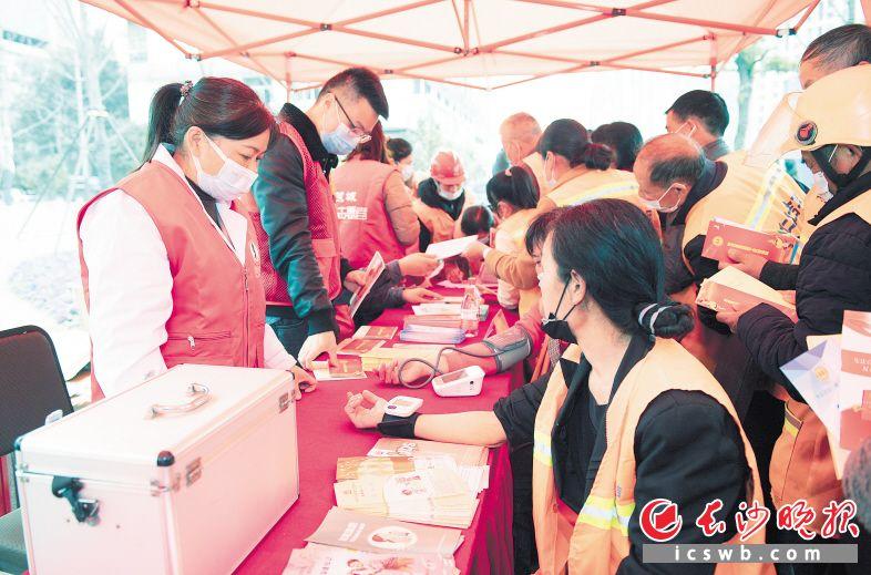 志愿者在免費(fèi)給環(huán)衛(wèi)工人做體檢。記者 鄒麟 攝