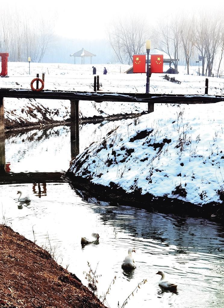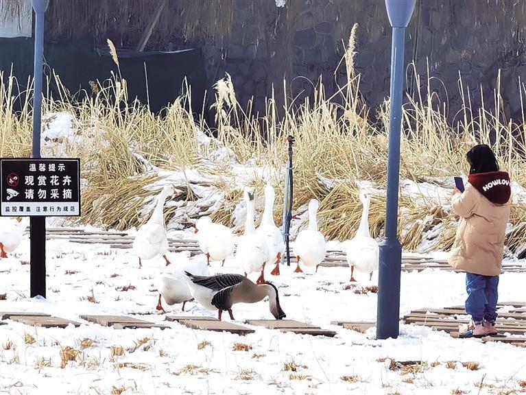 前幾日一場(chǎng)瑞雪,銀灘濕地內(nèi)銀裝素裹。記者午后采訪時(shí)看到,一湖碧水靜如明鏡,數(shù)十只鴛鴦?dòng)械南鄵硪黄鹣硎苤柟?,有的則在湖中央游來游去。木質(zhì)棧道上的積雪已被清掃,蜿蜒著向東西方向延伸。一群家鵝悠閑地在不遠(yuǎn)處歡叫,幾處涼亭、三五名游客……雪中的濕地顯得格外安寧、祥和。