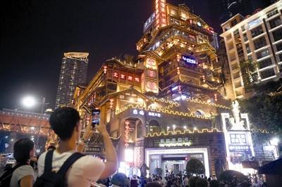 游客在重慶洪崖洞景區(qū)門口拍照留影。 記者 唐奕 攝