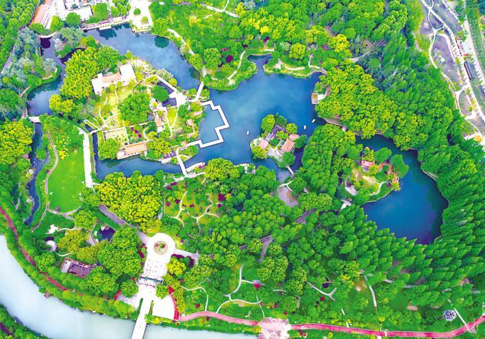 5月7日,鳥瞰武漢市青山公園,綠樹成蔭,生機勃勃。近年來,武漢市青山區(qū)加大生態(tài)文明建設(shè),昔日“灰城”展露青翠面容,近五年建成11座公園,人均公園綠地面積位居武漢前列。(記者 朱熙勇 攝)
