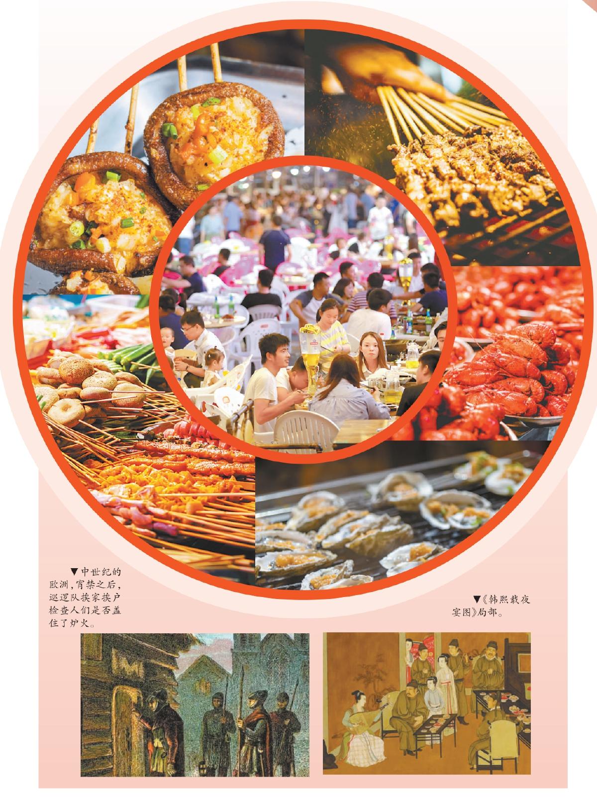 夏季的城市之夜格外熱鬧,夜市小吃攤的燈火次第點亮,一場屬于夜宵的狂歡也就此開始?!吧钜故程谩弊钅軗嵛棵β盗艘惶斓默F(xiàn)代人,然而回到幾百年前,夜晚的街道是禁止踏入的,甚至閉門在家也要熄滅爐火、禁止進食。從“宵禁”到“夜宵”的那些夜晚,記錄了人們戰(zhàn)勝黑暗恐懼、點亮城市生活的艱辛歷程。