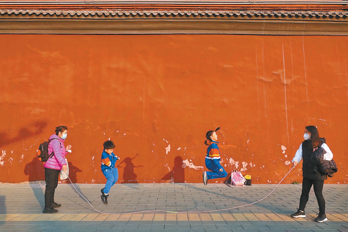 雍和宮古老的紅墻下,剛剛放學(xué)的孩子們?cè)诙张栂驴鞓返靥K。 楊建國攝