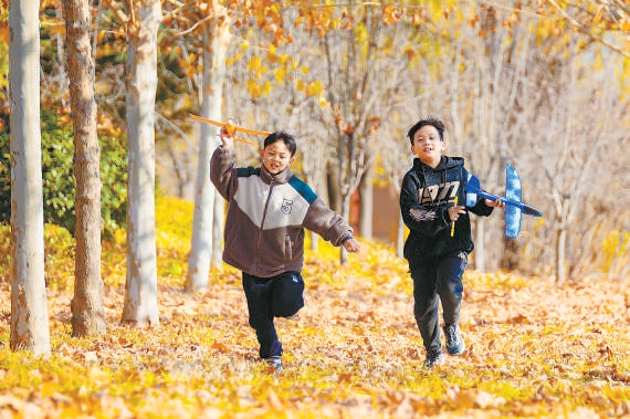郊野山林間,兩個(gè)孩子在金黃色的落葉堆中奔跑,享受快樂童年。 金建軍 攝