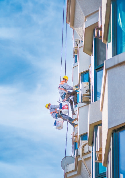 朝陽區(qū)將臺(tái)西路芳園里,工人們正在忙著為高樓“刷身洗臉”,守護(hù)美麗家園。劉玉松 攝