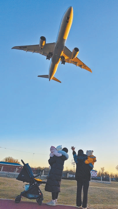 夕陽照耀著大地,給人們帶來溫暖和希望。首都機(jī)場,一家人正向著大飛機(jī)快樂招手。柳峰 攝