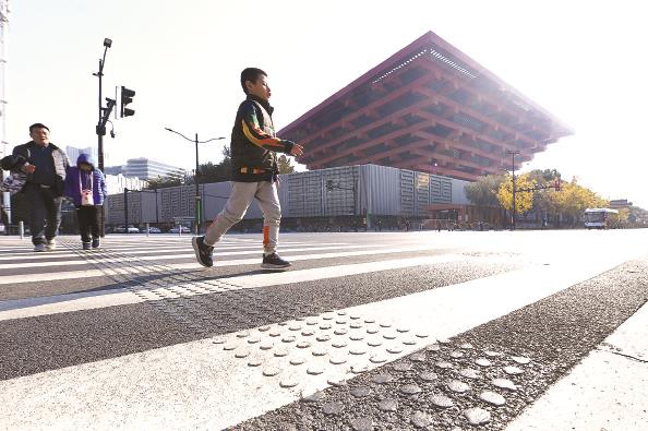 上南路人行橫道線上首次鋪設(shè)了過街盲道