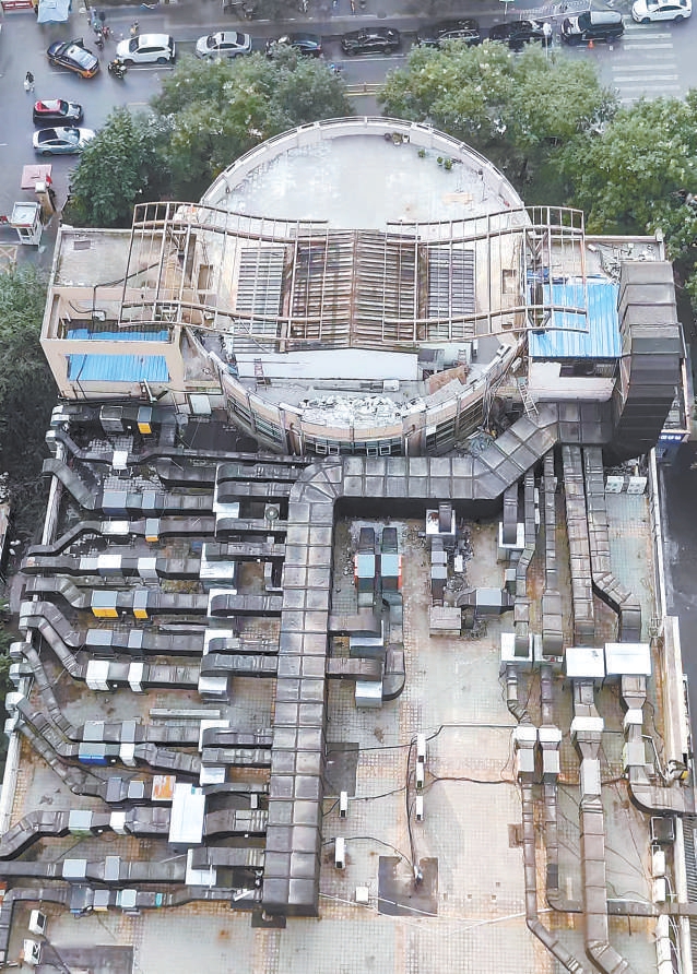 排煙管道、空調(diào)室外機(jī)……改造前,各類與餐飲企業(yè)相關(guān)的設(shè)備設(shè)施在百環(huán)家園18號(hào)樓西側(cè)商務(wù)小樓的樓頂散亂排布。