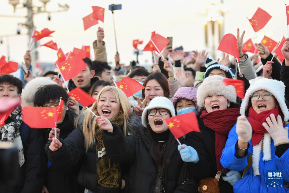 為親眼見(jiàn)證新年第一面五星紅旗冉冉升起,不少觀眾披著星光,凌晨一兩點(diǎn)就到廣場(chǎng)外圍等待?!邦^一次到北京,一定要感受下升國(guó)旗現(xiàn)場(chǎng)的震撼?!焙颖甭糜温殬I(yè)學(xué)院大一學(xué)生包興友,臉凍得通紅,但笑容燦爛?!白鳛槁糜螌?zhuān)業(yè)的學(xué)生,希望以后我能帶團(tuán)來(lái)看升旗,把這份激動(dòng)傳遞給更多人。”