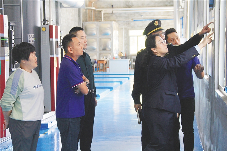 陽(yáng)光照進(jìn)鍋爐房?jī)?nèi),身穿藍(lán)色工服的工人做著日常維護(hù),瓊海市綜合行政執(zhí)法局工作人員在開(kāi)展檢查。