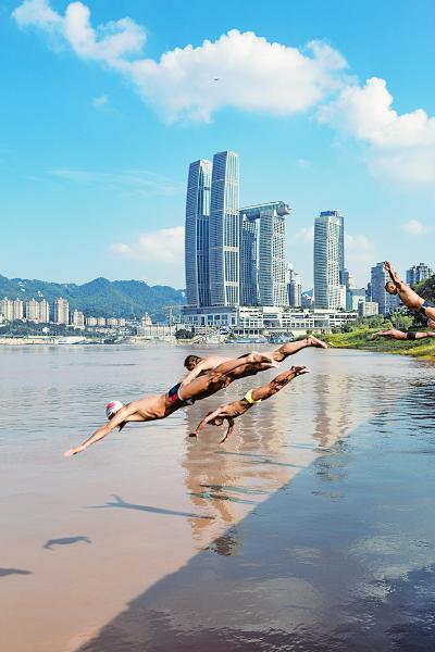 江邊“起飛” 重慶梁沱冬泳義務(wù)救援基地,游泳愛(ài)好者在練習(xí)跳水。