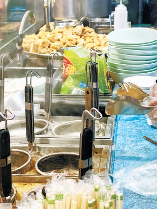 在一家名為“討喜燒牛雜檔”的餐館內(nèi),后廚店員正將一顆顆魚蛋從一個(gè)綠色商品包裝袋中取出,投入鍋內(nèi)加熱。很快,一碗牛丸魚蛋面就擺上了餐桌。