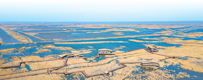 沿路前行,柳樹伸展著柔嫩的枝條;木棧橋兩側(cè),蘆葦隨風(fēng)搖曳。淺灘之上,鷗鳥群集,鳴叫聲此起彼伏。
