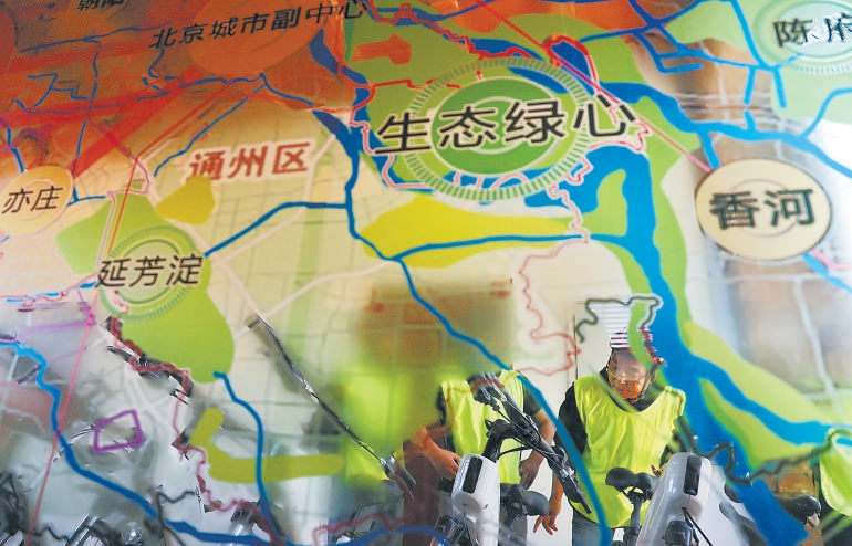 騎行驛站內(nèi)的玻璃幕墻上有一幅巨大地圖,展示著城市副中心與大運(yùn)河景區(qū)的發(fā)展變化。