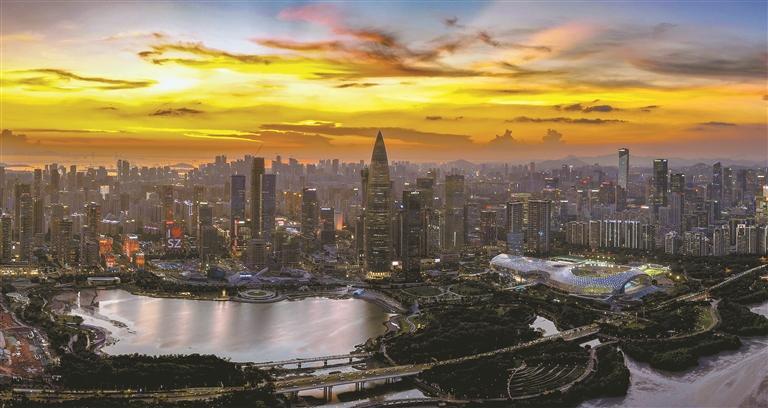 7月7日傍晚,深圳灣畔上演視覺大片。當天空被絢爛的晚霞染紅,正遇上城市華燈初上,霞光燈光交相輝映,美不勝收。記者 周紅聲 攝