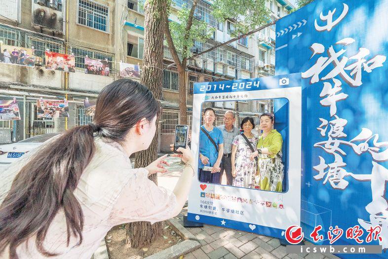 居民們在打卡板前合影留念。長沙晚報全媒體記者 陳飛 攝