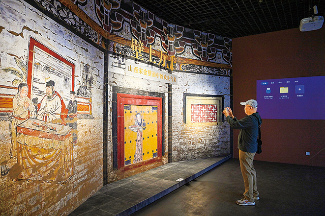 在山西博物院,游客在“壁上萬千——山西宋金壁畫中的眾生氣象”展覽上拍照(2024年5月16日攝)。記者 楊晨光 攝