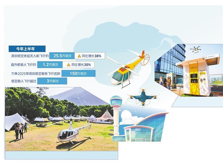 當(dāng)前,深圳低空應(yīng)用場景已覆蓋空中通勤、低空觀光、物流配送、城市治理、應(yīng)急救援等各個(gè)領(lǐng)域,僅在物流配送方面,便涉及快遞配送、餐飲配送、醫(yī)療運(yùn)輸、生鮮冷鏈等。今年上半年,深圳低空載貨無人機(jī)飛行量、新增貨運(yùn)航線、載人飛行量、運(yùn)送人數(shù)規(guī)模均居全國前列。其中,低空貨運(yùn)無人機(jī)飛行約25.5萬架次,同比增長38%;直升機(jī)載人飛行約1.2萬架次,同比增長20%。目前,深圳正進(jìn)一步拓展應(yīng)用服務(wù),力爭2025年低空載貨飛行達(dá)到150萬架次,低空載人飛行超過3萬架次。