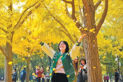 地壇公園銀杏大道金色燦爛,眾多游人來這里擁抱秋天,享受美景。 楊建國 攝