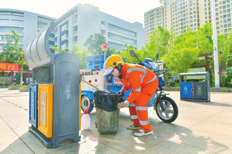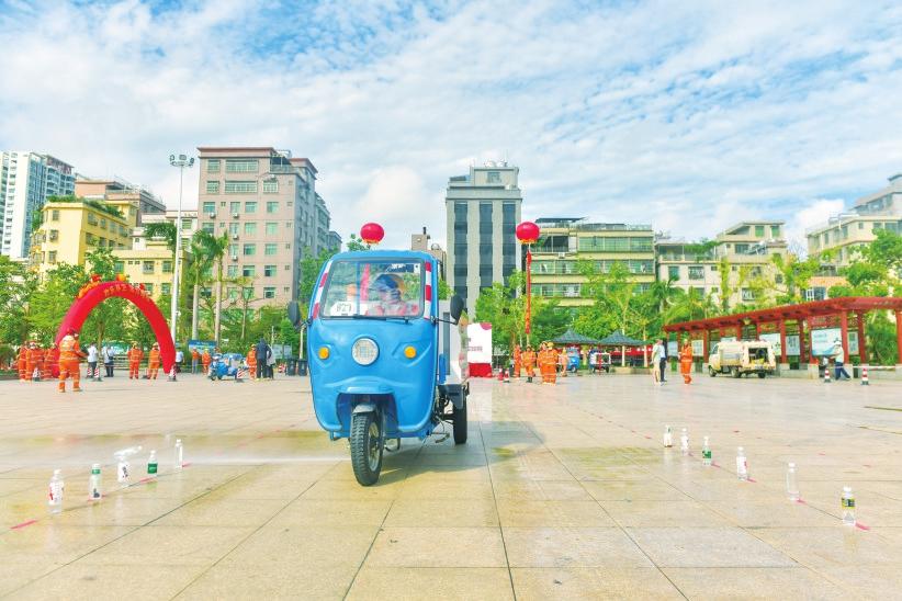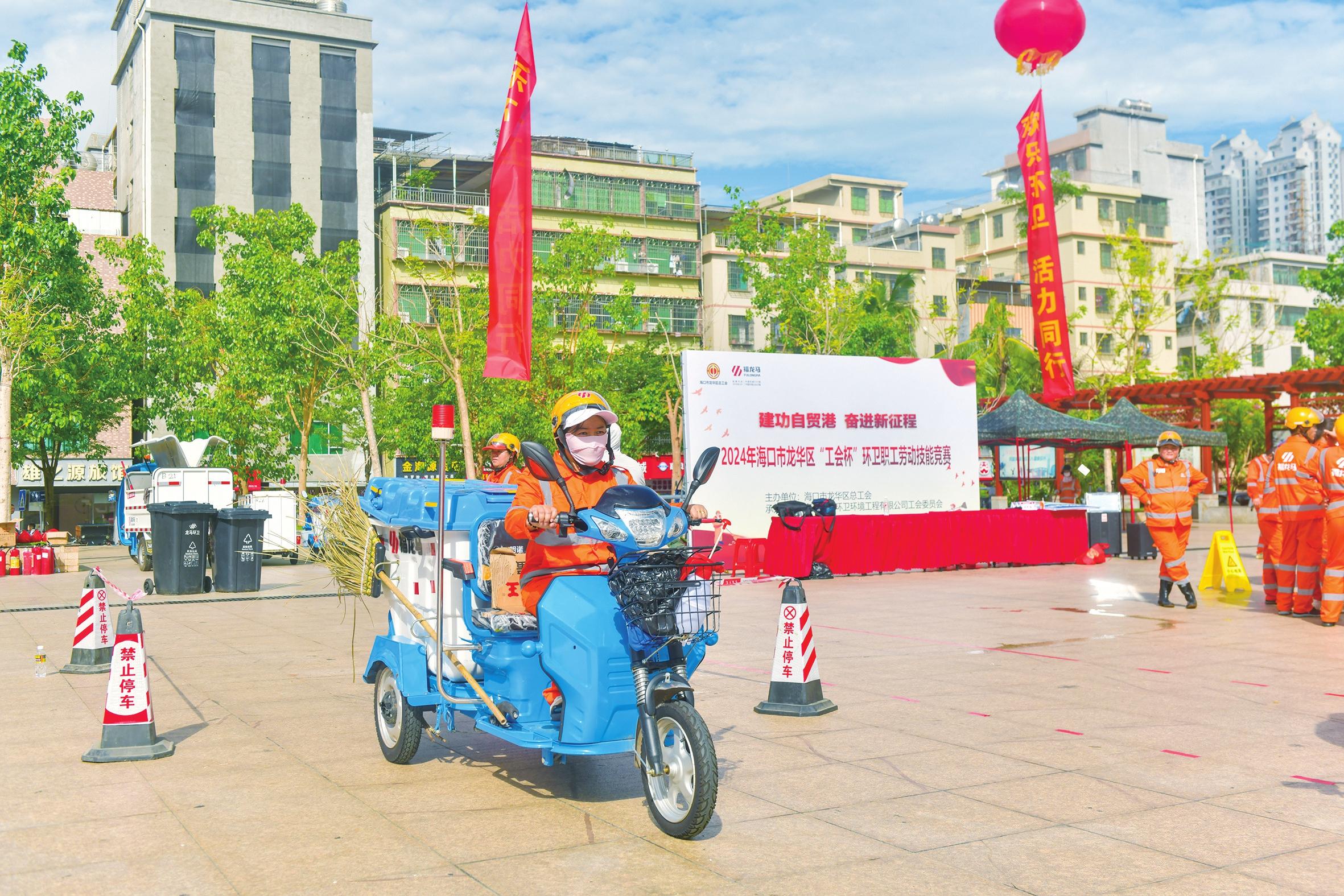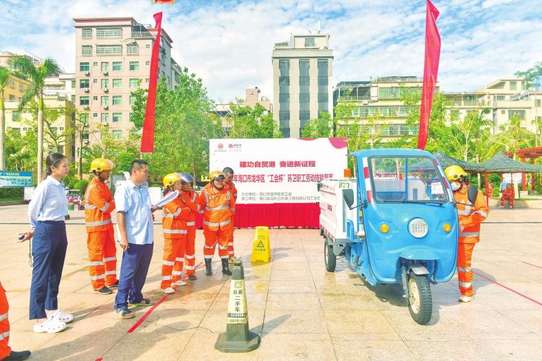 10月18日,??谑旋埲A區(qū)雙創(chuàng)廣場上熱鬧非凡,福龍馬??诠窘倜h(huán)衛(wèi)工人在進(jìn)行技能比賽。他們激情四射,將自己最好的狀態(tài)、精湛的技術(shù)展現(xiàn),贏得了陣陣歡呼。