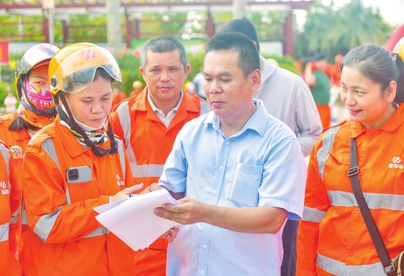 龍華區(qū)總工會黨組成員、副主席林勝雄,龍華區(qū)環(huán)衛(wèi)局副局長符嬌燕,福龍馬海口公司總經(jīng)理黃彪、副總經(jīng)理邢益芳、楊志剛出席,向?yàn)槌鞘忻利愋燎诟冻龅沫h(huán)衛(wèi)工人們加油打氣,并致以誠摯的感謝和節(jié)日的祝賀。