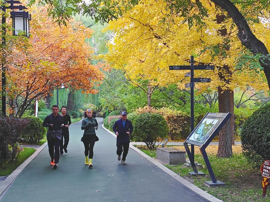 11月3日,太原市迎澤公園內(nèi),金黃的秋葉給微涼的清晨增添一抹亮色,市民們?cè)缙鹋懿剑诠珗@內(nèi)呼吸著雨后的清新空氣,享受城市生態(tài)之美。申晉光 攝
